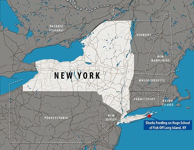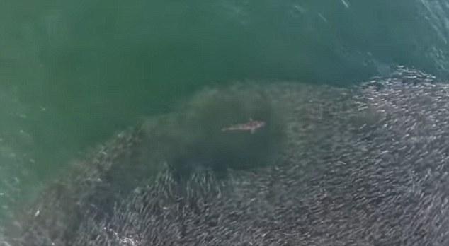 一场暴风雨将大量的鲱鱼送到了汉普顿斯岸边500米处,这里对于纽约人来说是夏天度过周末最佳的地方。这些鱼吸引了鲸鱼、鲨鱼和海豚,它们都以鲱鱼为食。其中,无人机的航拍镜头记录下了三条鲨鱼的捕食画面。鲨鱼冲入了鱼群捕食,鱼群却纷纷躲避,形成了有趣的画面。
