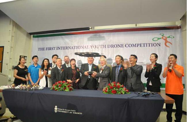 本次无人机大赛在名誉主席万锦市市长薛家平(Frank Scarpitti)和多伦多大学应用科学与工程学院副院长Tom Coyle教授共同遥控无人机冉冉升空中宣布开幕