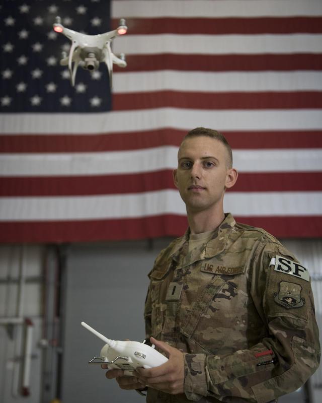 美国空军网站发布消息,美国空军第445远征联队的安全部队开始装备大疆无人机,主要用于训练部队在遭遇消费级无人机的攻击时该如何正确应对。图为第445远征联队安全部队的士兵,手持大疆无人机。