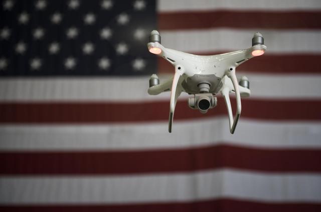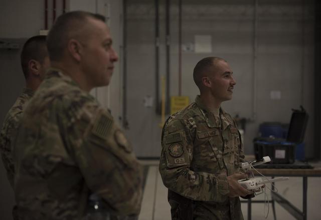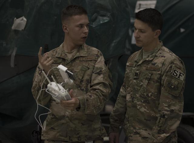 图为美军第445远征联队安全部队的士兵,正在对一架大疆无人机进行测试。
