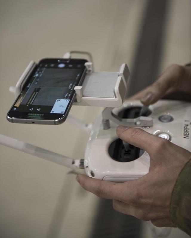 图为第445远征联队安全部队的士兵,正在操作一架大疆无人机。