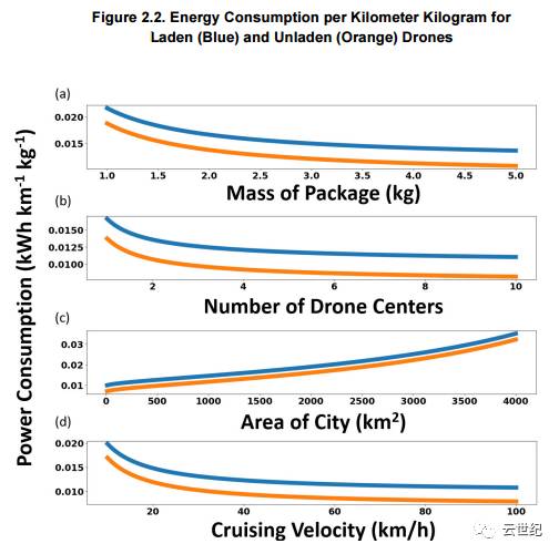 满载(蓝色)和非满载(橙色)每公里/千克无人机能源消费曲线
