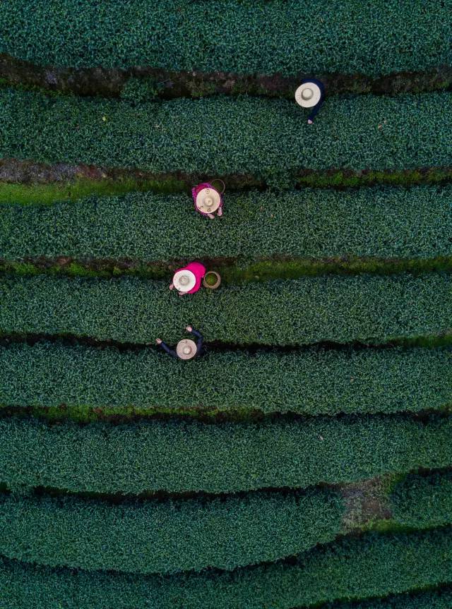 2017年3月18日,茶农们在杭州梅家坞村的茶园内采摘2017年首批西湖龙井。