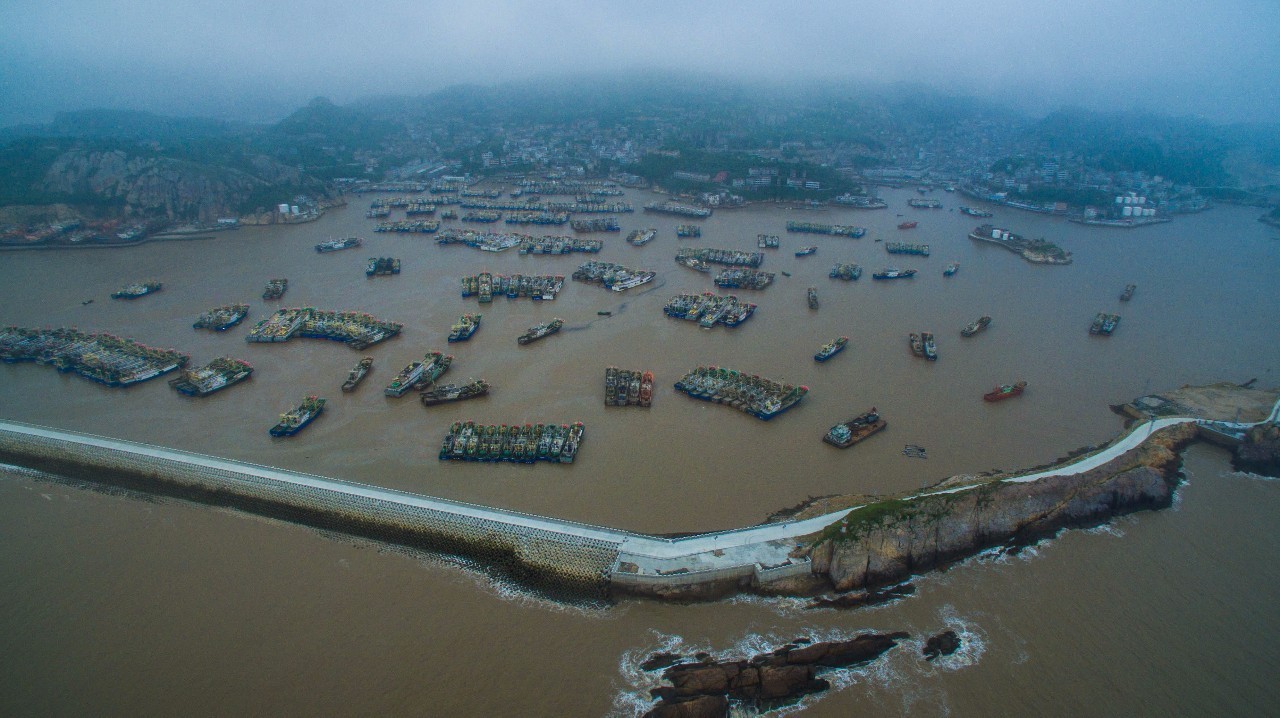 2015年7月9日台风“灿鸿”升级,浙江温岭风力加大渔船归港。