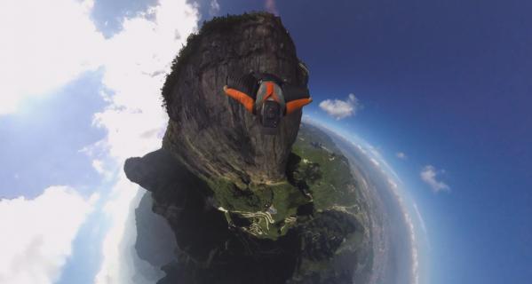 它可以先拍摄后取景,比如在翼装飞行中,将ONE固定在头盔上,一次飞行机会,拍摄回来的画面是实时拼接的360°全景运动画面,通过软件可以剪辑出不同视角的影像。