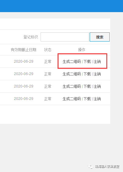 5、此时回到【无人机管理】页面,可以看到刚刚添加的无人机出现列表中,点击最右方的生成二维码按钮,无人机实名登记系统将为该台无人机生成专属二维码,并通过邮件的形式发送到注册时填写的邮箱中。