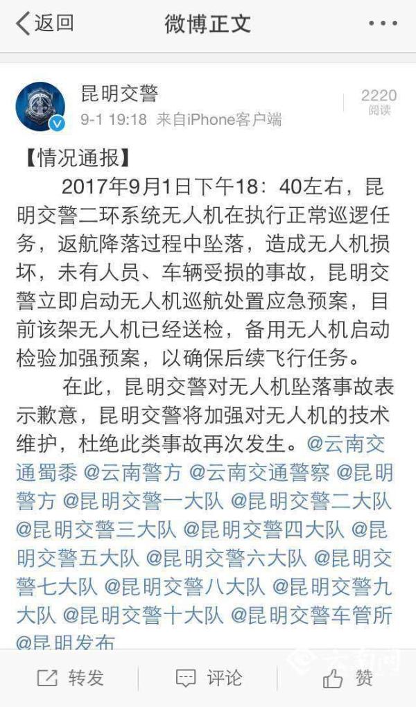在此,昆明交警对无人机坠落事故表示歉意,昆明交警将加强对无人机的技术维护,杜绝此类事故再次发生。