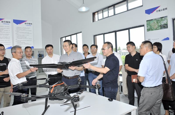 民用无人机试飞运行基地负责人陈光文(右四)向民航华东管理局姜春水书记(左五)、青浦区副区长余旭峰(左二)、民航华东管理局副局长朱州龙(左四)介绍无人机