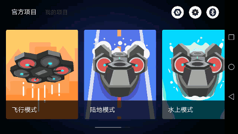 首先,官方提供了四种已经编程好的运动模式,分别是飞行模式、陆地模式、水上模式和炫彩陀螺模式,每一个模式下都有相对应的控制面板。此外,还提供了一个我的项目,用于自定义个性化编程。
