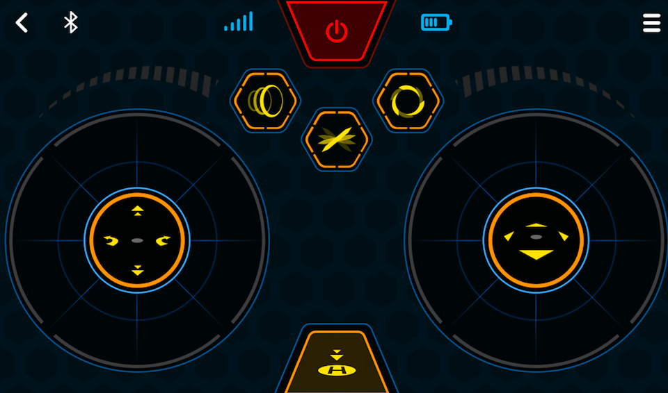 以飞行模式为例,开机键准备起飞,左边摇杆负责高低,右边负责方向。控制面板中还会显示电池续航、联网状态等参数。