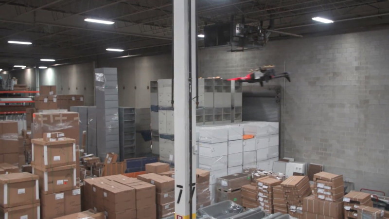 Parrot Bebop 2 负载讯号中继器,穿疏于货架之间,担当 RFID 扫描器与标签之间的通讯桥梁。
