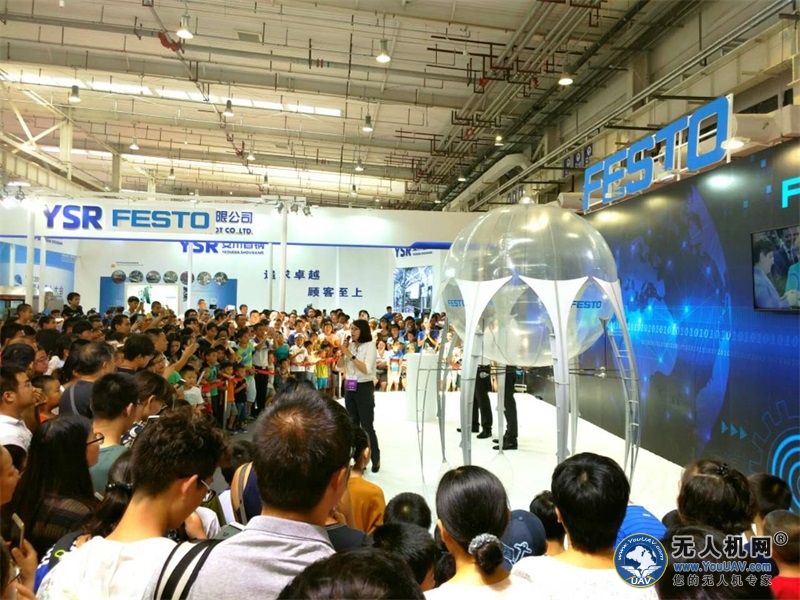 在2017世界机器人大会上不仅有各式各样的机器人和无人机,而且有一款吸睛度很高的无人飞行器,其模样像一只巨型章鱼并在室内进行一系列的飞行表演,引得现场观众纷纷叫好并拍照留念。