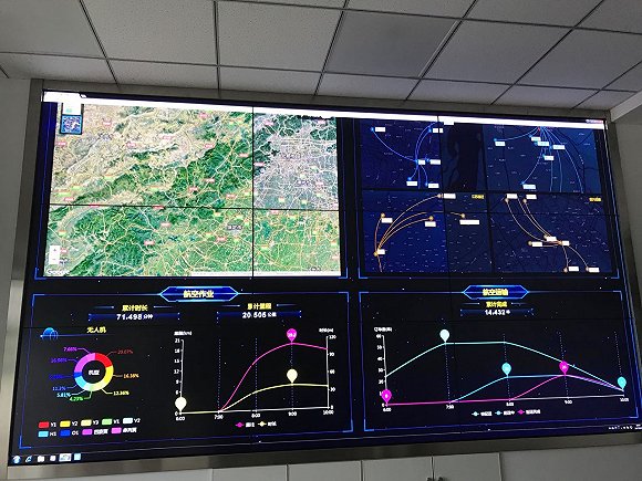 二楼的一个小房间里,一块大屏幕上显示了所有京东无人机的飞行状况,包括定位、时速、飞行时间和包裹、订单的参数。无人机飞行时,两名运营人员在大屏幕前进行监控。