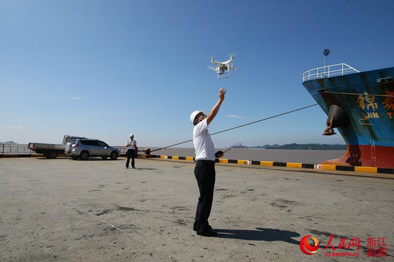 今年以来,北仑检验检疫局探索利用智能无人机进行水尺计重,从操控无人机起飞,对船舶外侧水尺进行观测和录像,到无人机安全降落,全过程仅需10多分钟时间。