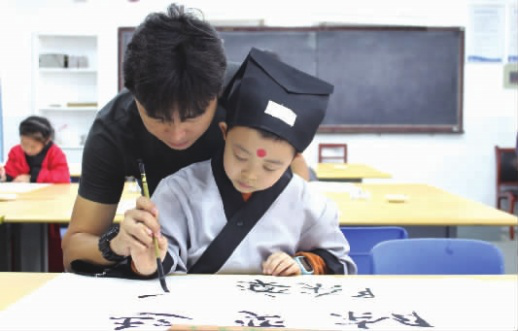 仪式共分为正衣冠、朱砂启智、感恩鞠躬、击鼓鸣志、启蒙描红五个环节。所谓“童蒙之学,始于衣冠”,身穿汉服的孩子们在老师的指引下,学习整理自己的衣冠。随后,老师给新生进行“朱砂启智”(又称“开天眼”),班主任用朱砂在新生的额头正中点上红痣,意为开启智慧。