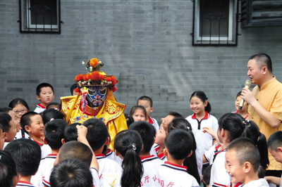舞狮、中幡、川剧变脸、抖空竹、飞叉……北京市东城区分司厅小学优质教育资源带的学生们刚开学就享受了一场非物质文化遗产的盛宴,30余位传统文化艺人一边展示着“非遗”的魅力,一边与同学们互动。舞狮表演者走到学生面前,翻滚跳跃,摇头抖毛,威武又可爱,引来学生的欢笑赞叹;抖空竹表演者现场收徒,手把手传授技术,学生们学得飞快,转眼就抖得有模有样。