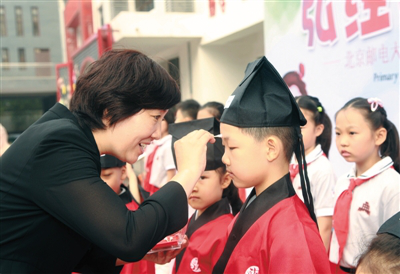 9月1日,北京邮电大学(分数线,专业设置)附属小学全体一年级新生身着汉服,参与“正衣冠”、“点朱砂”等仪式,体验了一次原汁原味的“开笔礼”后,正式开启了小学生活。