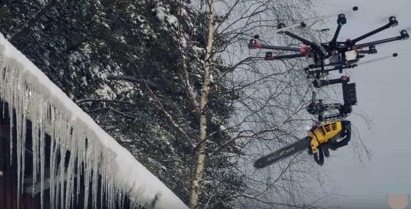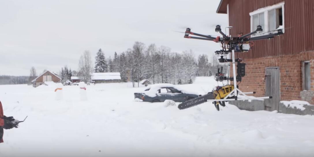 不过由于当时试验这辆无人机修剪树枝的技术时当地还处于寒冬的季节,所以需要远离人群的郊外森林里面。