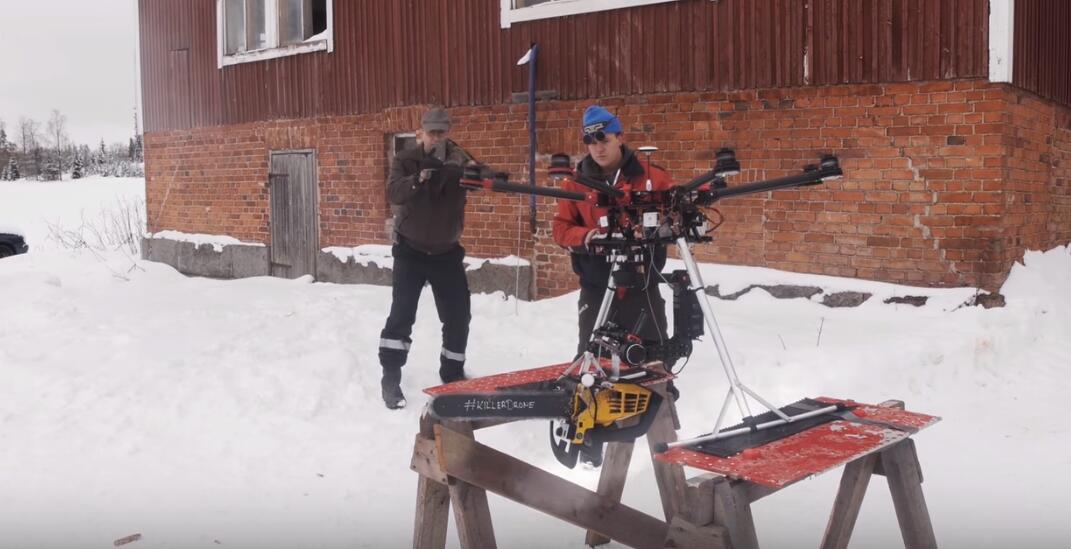 可以看到,他们就这样将一把锋利的电锯用铁质材料固定在无人遥控机的摆臂上,甚至可以通过遥控上下左右的摆动。