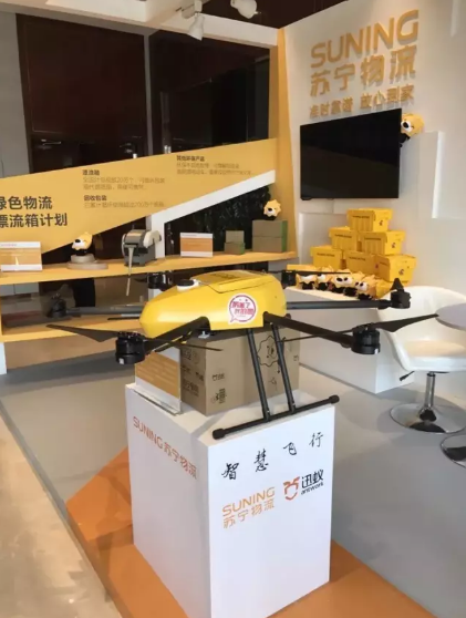 另一边,苏宁与迅蚁合作研发的无人机也亮相苏宁物流展区,吸引了众多目光。
