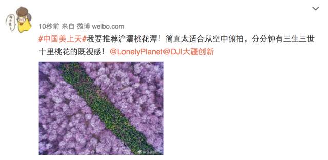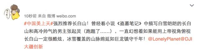 9月11日-9月19日期间,编辑微博,添加话题#中国美上天#,并同时@DJI大疆创新和@LonelyPlanet,把你心仪的中国境内目的地推荐给我们。