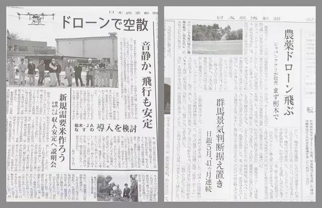 大疆农业植保机大量的运用案例得到日本媒体的关注,日本农业报表示,大疆农业植保机的进入,给当地农业生产带来利好。日本经济报则报道了大疆农业植保机在栃木县进行高效植保作业。