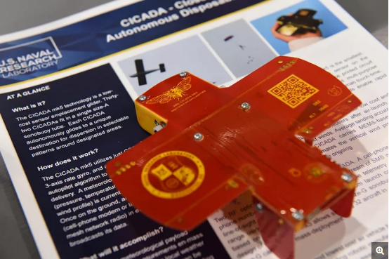 该技术的设计使其滑翔比为3.5比1,这意味着它每下降0.3英尺(0.3米)向前飞行3.5英尺(1.1米),NRL报道。每个CICADA“微型”无人机重量约为1.2盎司(35克),并附有电路板和传感器有效载荷,它们结合了GPS技术,帮助他们在距离地面目的地15英尺内进行导航。IEEE Spectrum公司报道说,一旦在地面上建立的天线将数据传送回家。