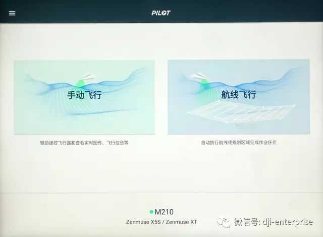 打开 DJI Pilot 的界面首先出现的是手动飞行和航线飞行两个选项,如果是手动飞行界面则跟我们常用的 DJI GO 和 DJI GO 4.0 类似。如果是点击航线飞行的话……那么,对不起!暂时还没开放。