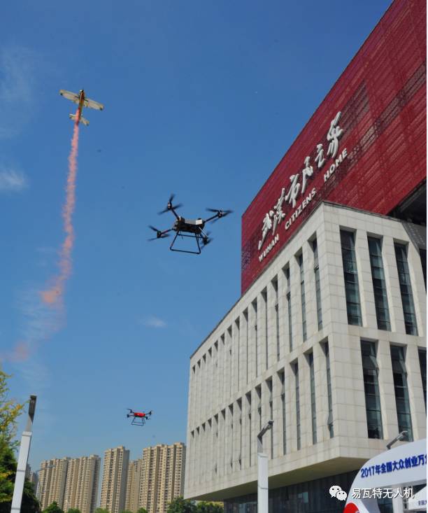 现场,易瓦特飞行组为观众带来了别具一格的无人机飞行盛宴。伴随着两架多旋翼无人机一飞冲天,现场观众的目光瞬间被吸引。紧随其后的是航模的特技表演,飞手熟练地操控着,时而螺旋上升,时而盘旋飞行,精彩绝伦的拉烟表演,让现场观众过足了瘾,引爆了活动现场的气氛。