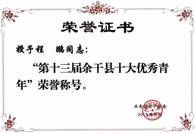 在工作中,程鹏多次获得全国性奖项及荣誉称号。2015年,获评农业部“全国万名现代青年农场主”称号。2016年,他以公司作为参赛项目,在“创青春”全国大学生创业大赛中一举斩获全国金奖。2017年,又荣获“第十三届余干县十大优秀青年”称号。