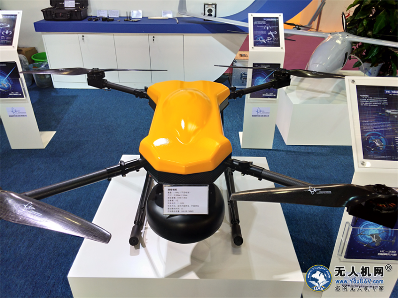 9月14日-17日,在第四届天津国际直升机博览会上展出了各种民用、商用和警用的载人直升机。在直博会中我网人员看到了一个熟悉的朋友,那就是本月初曾参加100公里跨海挑战的蜂巢HC-330(混动电驱四旋翼)无人机。此次展会蜂巢航宇还携多款混合动力无人机及地面测控车、航天热管、小卫星、倾斜摄像机、激光清障器等设备一同亮展。