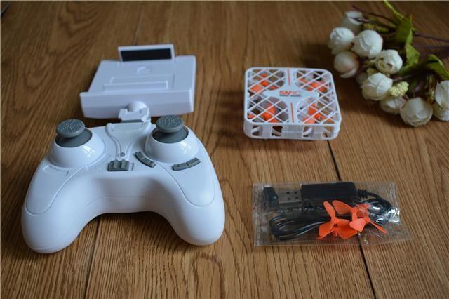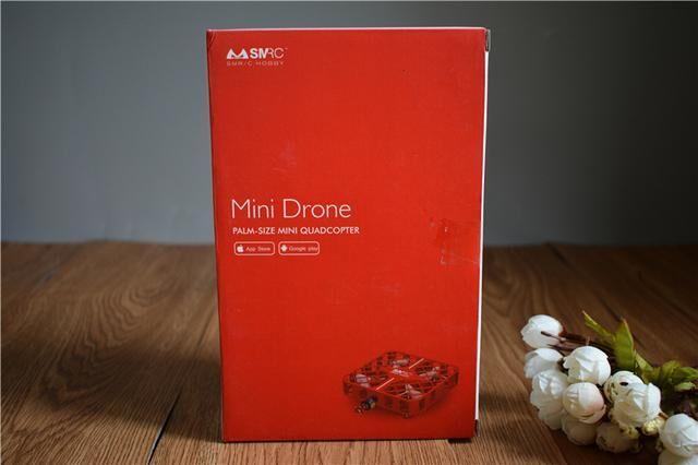 包装方面,是一款红的的长方形包装,从包装的外观来看,就可以知道其实无人机并不会很大喽,那都有一些什么配件呢?除了小巧的smrc迷你无人机外,还有操纵手柄,充电设备,以及可以更换的螺旋桨叶。