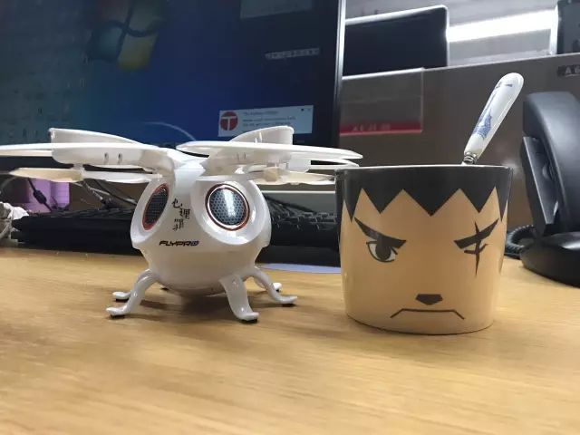 和水杯合影,可以看出乌贼的机身体积挺小巧,比一般水杯都要小一圈。