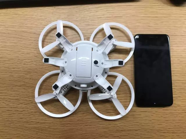 和红米手机合影,螺旋桨保护罩占了比较大空间,但也提供了足够的安全性。