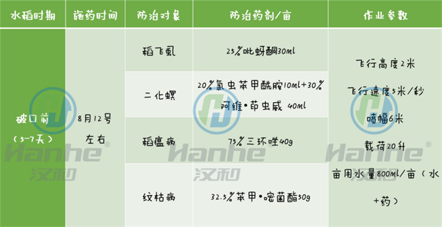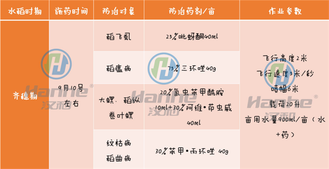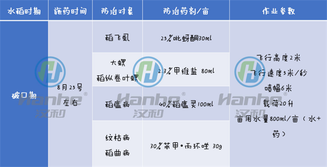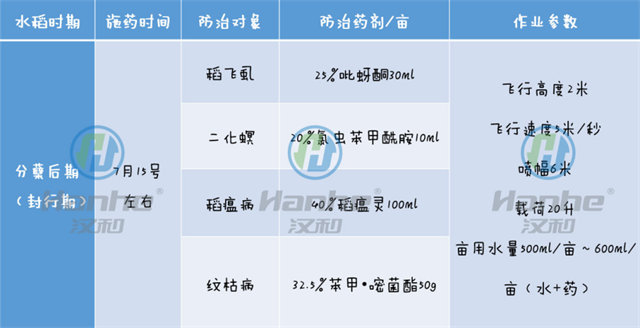 (备注:1,每个时期施药,添加专用航空助剂5g;2,后期可以施用一些叶面钾肥)