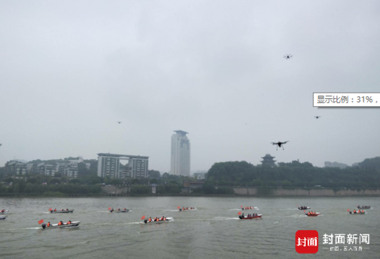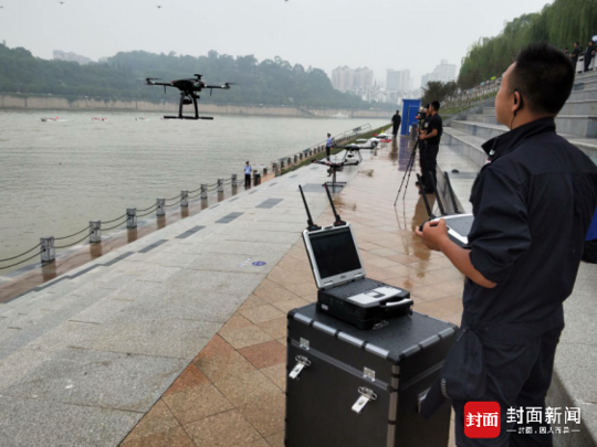 上午10点,一艘沱江上行驶的观光船浓烟滚滚,游客情急之下跳水逃生,这是“水中救援”科目的一次突发险情的模拟场景。接到命令后,水上冲锋艇从多个方向进击救援,同时10多架专业无人机升空,记者看到,公安民警熟练操作无人机快去接近被困游客上空悬停,无人机有各自的不同分工,有的是专门负责稳定被困者情绪的喊话无人机,有的专门负责从空中空投救生衣。无人机的空投,以最快速度将最急需的救援装备送到被困人员手中。短短1分钟,所有落水的被困游客全部获救。舟船和无人机的有力配合,赢得了观摩者的热烈掌声。