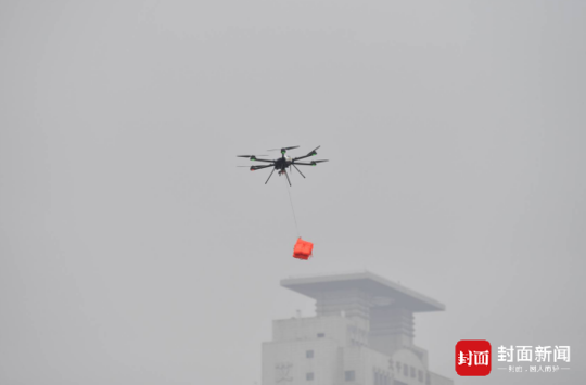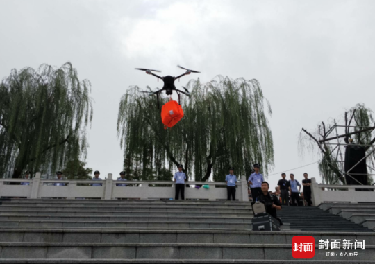 一艘观光船在江面突然发生大火,被困游客跳江在水中挣扎。很快,几艘公安冲锋艇快速出击,劈波斩浪。而在冲锋艇赶到前,一架架无人机各带一个救生衣飞到被困者上空实施空投,被困者得到救援。