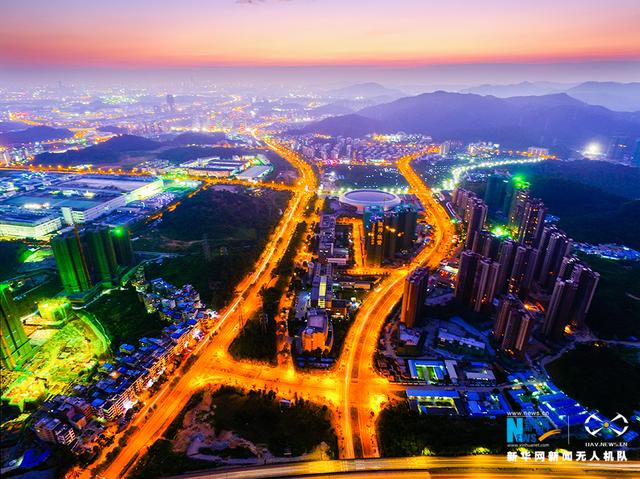当夜幕降临,无人机从广州的官田收费站往黄埔大桥的方向俯瞰体演中心。