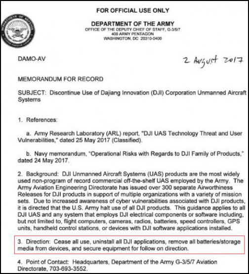 备忘录称,由于“网络安全漏洞”(cyber vulnerabilities)问题,要求陆军各部门停用大疆生产的无人机和设备、部件,卸载所有大疆应用,卸掉电池等等。