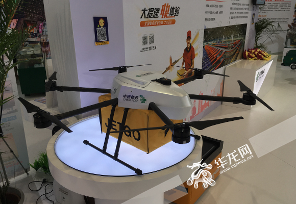 中国邮政集团公司展位上邮政寄递翼展区展示的无人机“快递员”。