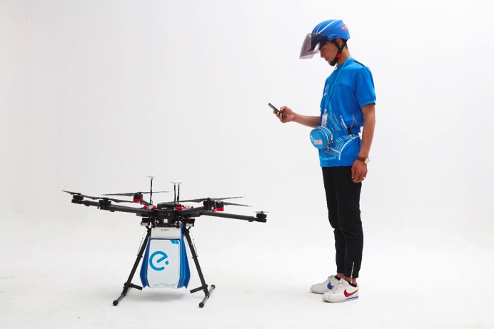 外卖无人机E7在各项核心指标上达到实际应用水平,其最高飞行速度65千米/时,最大载重6千克,满载续航距离达20千米,其挂载的外卖箱采用气柱材料特制,自重仅485克,容积可达20升。