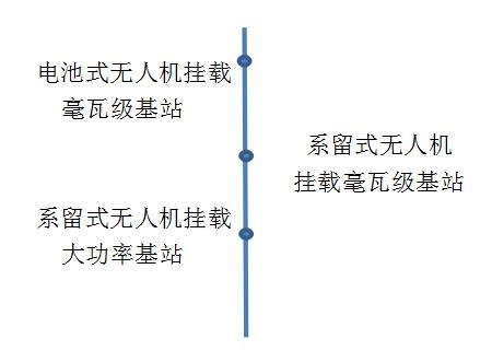 电池无人机虽然技术成熟、应用广泛,但是有一个极大的限制,即飞行时间短。典型的电池式无人机挂载负载时的飞行时间一般不超过30分钟。这个飞行时间对于短时间的简单任务还可满足需求,但是对于应急通信场景,往往需要应急基站在传统地面宏站恢复工作之前持续运行数小时以上,这时30分时的飞行时间便无法满足要求了。