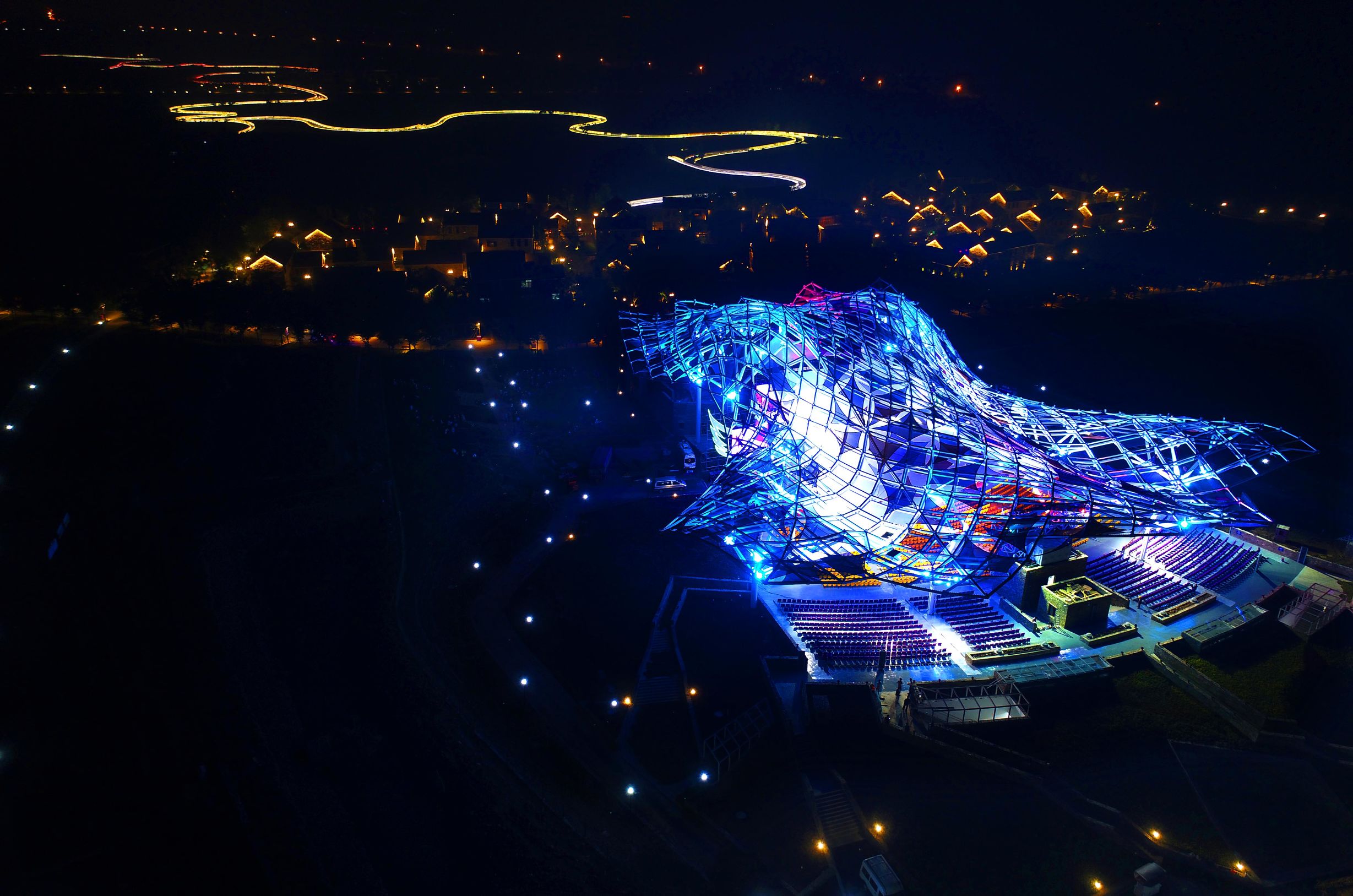 2017年9月24日傍晚,宿迁三台山国家森林公园衲田花海秀场和彩虹桥等景点同时亮灯。璀璨的灯光辉耀花海。摄影师通过无人机鸟瞰,衲田花海秀场更像一艘五彩航天飞船,翱翔在银河星空,让人惊叹。2017年9月25日晚,第三届亚洲青年微电影展颁奖盛典,将在这充满诗情画意的华夏微影衲田花海微电影小镇举行。