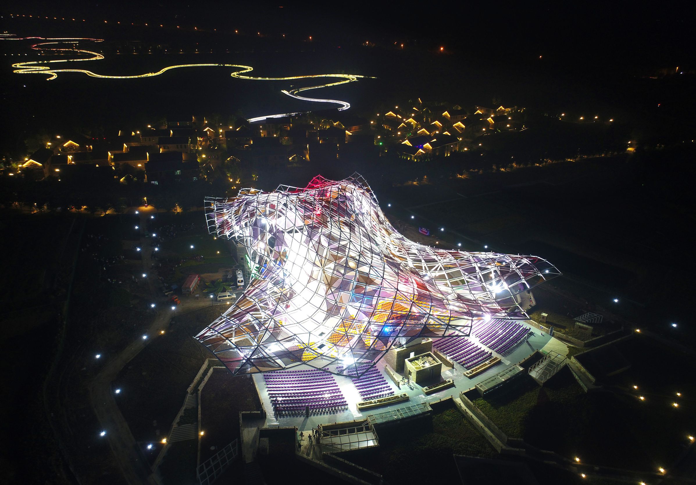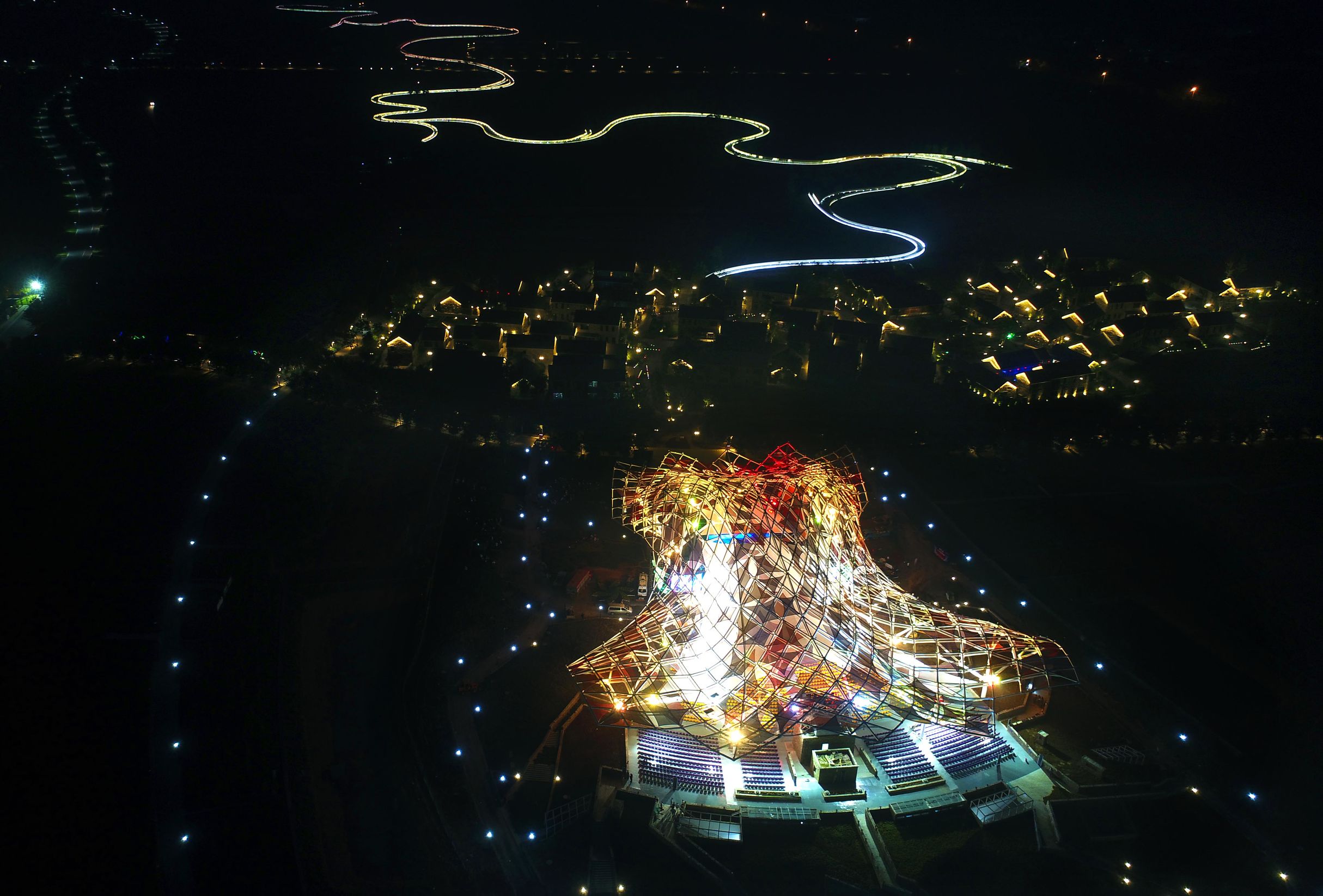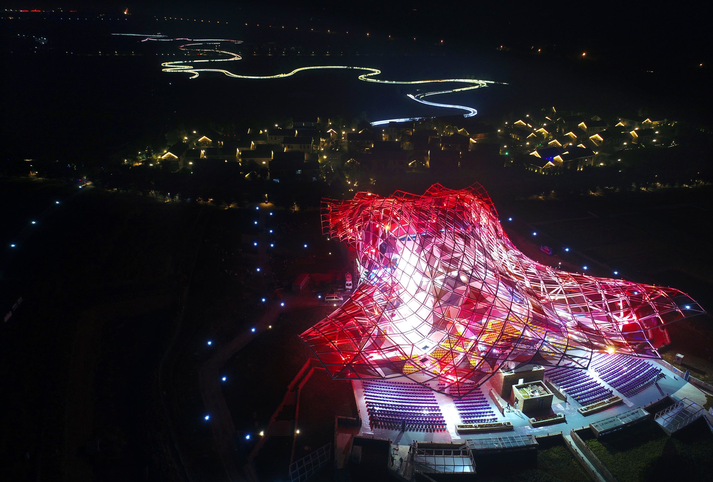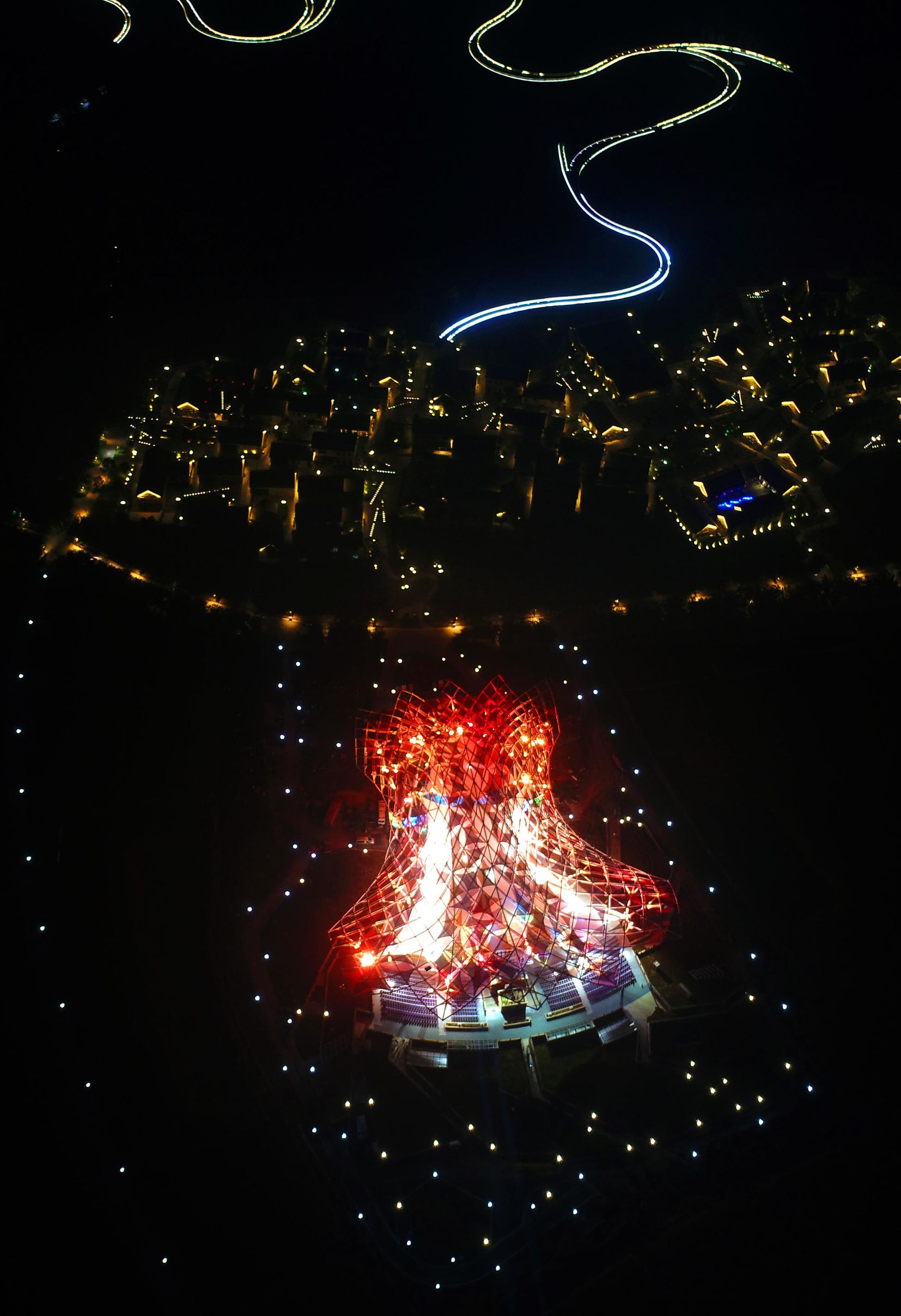 摄影师用无人机航拍的红色衲田花海秀场,亮灯后的彩虹桥更像一条延绵的银河。