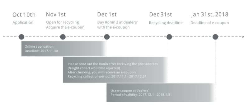 DJI 云台产品少有优惠,于今天( 9月25日 )开始发货的 Ronin 2 难得被纳入优惠范围。只要你拥有 Ronin 云台,在 2017 年 10 月 10 至 2018 年 1 月 31 日期间登录 DJI 官方网站,登记 Ronin 产品 IMU SN 码及简单资料,后把旧款产品寄往回收地址,三个工作天内即可获取价值约 6,600 元人民币 的电子优惠券码, 12 月可用以购买 Ronin 2 ,变相全新云台只需 39,526 元人民币,对有意入手 Ronin 2 的人士来说可谓大好消息。