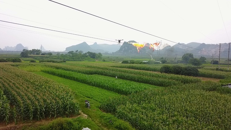 只见一条烈焰从无人机的喷枪中喷射出来,精准喷射到塑料薄膜上,薄膜立即燃烧、熔化,随之从导线上掉落。贵港网区的首次无人机喷火清除异物的作业圆满成功。整个过程包括装机、起飞、降落不过15分钟,也无需办理停电手续,相比传统方法,大大提高了作业效率和安全系数。