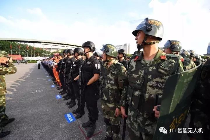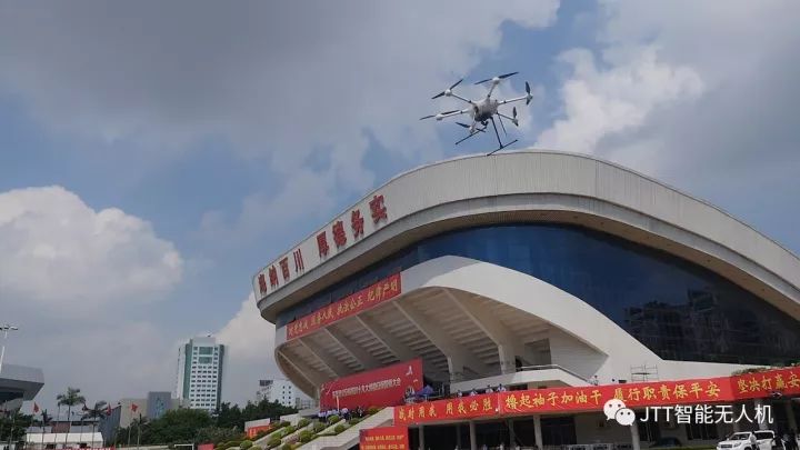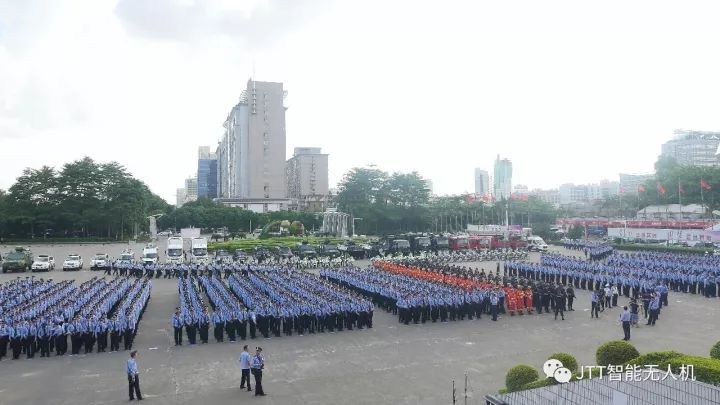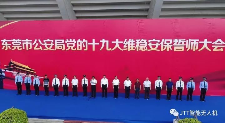 智璟科技(JTT)受邀助阵东莞市公安局十九大维稳安保誓师大会。T60警用无人机T60 v2、T60 v1组成无人机编队 ,紧随铁骑队入场,在指挥人员发出的指令下,有条不紊列队飞过审阅台,出色的完成此次任务。