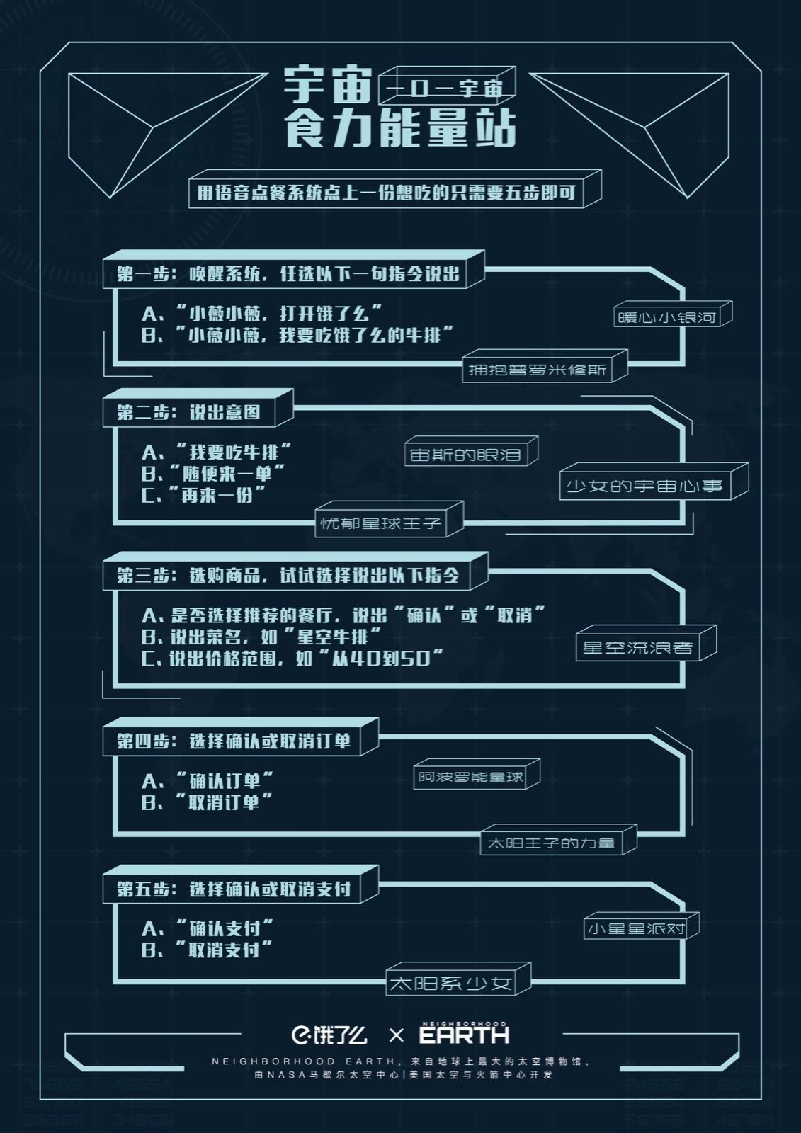 《星球奇境》宇宙特展来自太空博物馆Neighborhood Earth,由NASA马歇尔太空中心以及美国太空和火箭中心开发,带领观众零距离触摸外太空。作为展方唯一合作外卖平台,饿了么在展览中特别开设太空科幻主题餐厅——“宇宙食力能量站”。在提供各种科幻感十足的美食之外,餐厅还展示了众多饿了么的“黑科技”,其中,全新研发的语音点餐系统更是首度亮相。