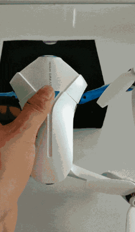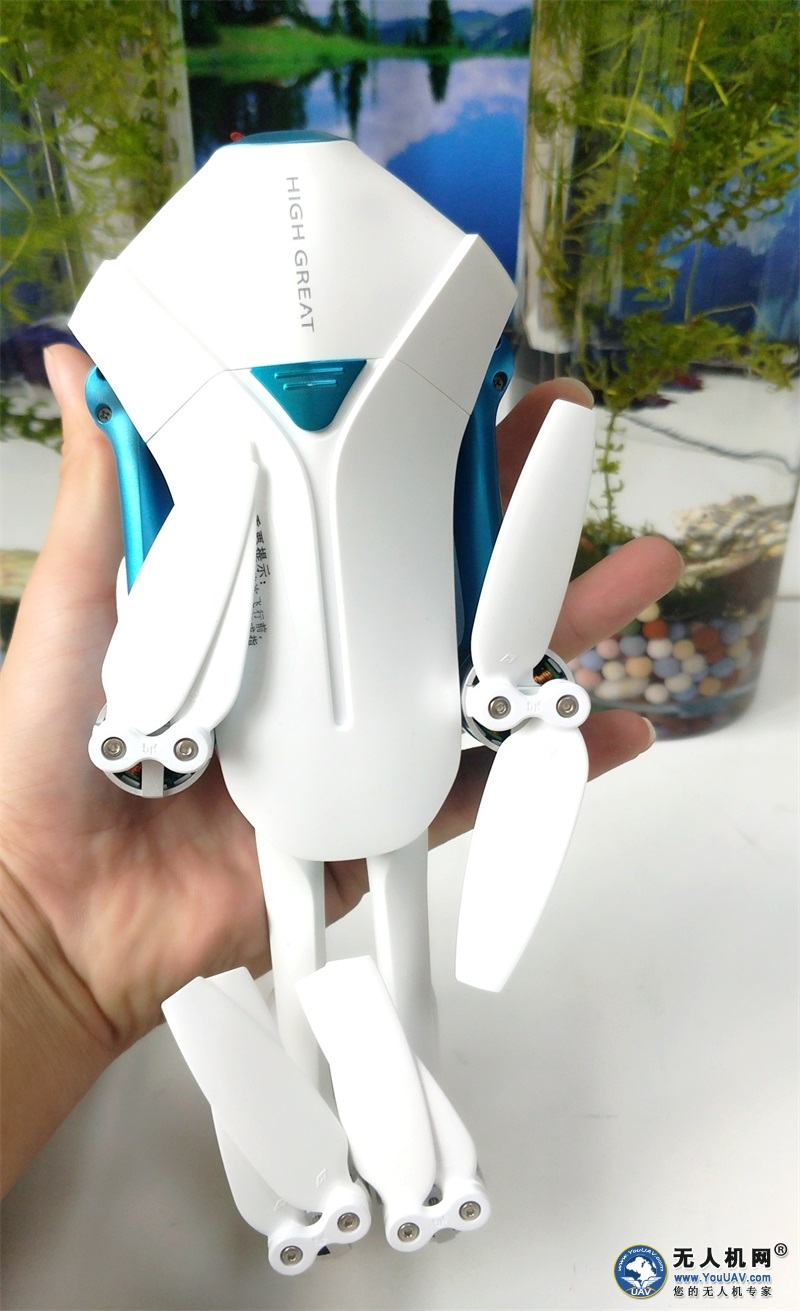 TAKE折叠以后其机身尺寸约莫一个成人手掌大小,不过其两条小长腿得露在手掌之外,其展开后的尺寸约为230mm左右,而且其重量即便是加上电池后也感觉很轻,这样的设计其目的估计是为了消费者携带方便,起到随带随飞的作用。