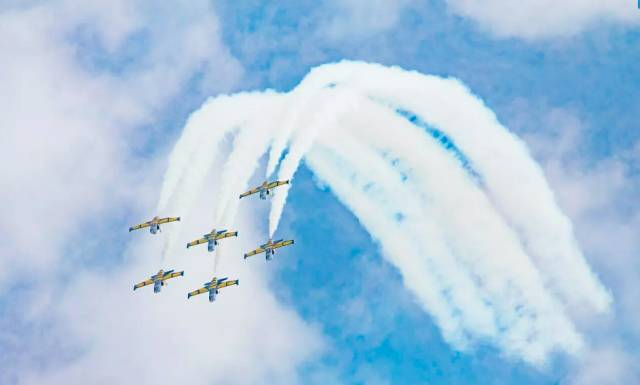 开幕式过后,5支世界特技飞行表演队进行了精彩的表演。20余架飞机展翅天空,让观众零距离感受飞机的轰鸣,欣赏绝妙的空中之舞。